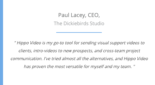 " Hippo Video is my go-to tool for sending visual support videos to clients, intro-videos to new prospects, and cross-team project communication. I've tried almost all the alternatives, and Hippo Video has proven the most versatile for myself and my team. "