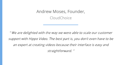 " We are delighted with the way we were able to scale our customer support with Hippo Video. The best part is, you don’t even have to be an expert at creating videos because their interface is easy and straightforward. "