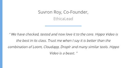 " We have checked, tested and now love it to the core. Hippo Video is the best in its class. Trust me when I say it is better than the combination of Loom, Cloudapp, Droplr and many similar tools. Hippo Video is a beast. "